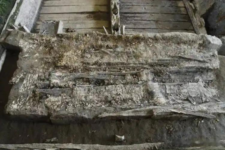 椁室由楠木隔断和立柱分为25个独立分室,中央安置一艘船形主棺,彰显墓主人尊贵身份。
